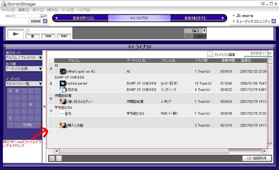 3:適当なmp3ファイルをマイライブラリーにドラッグ&ドロップしてください。